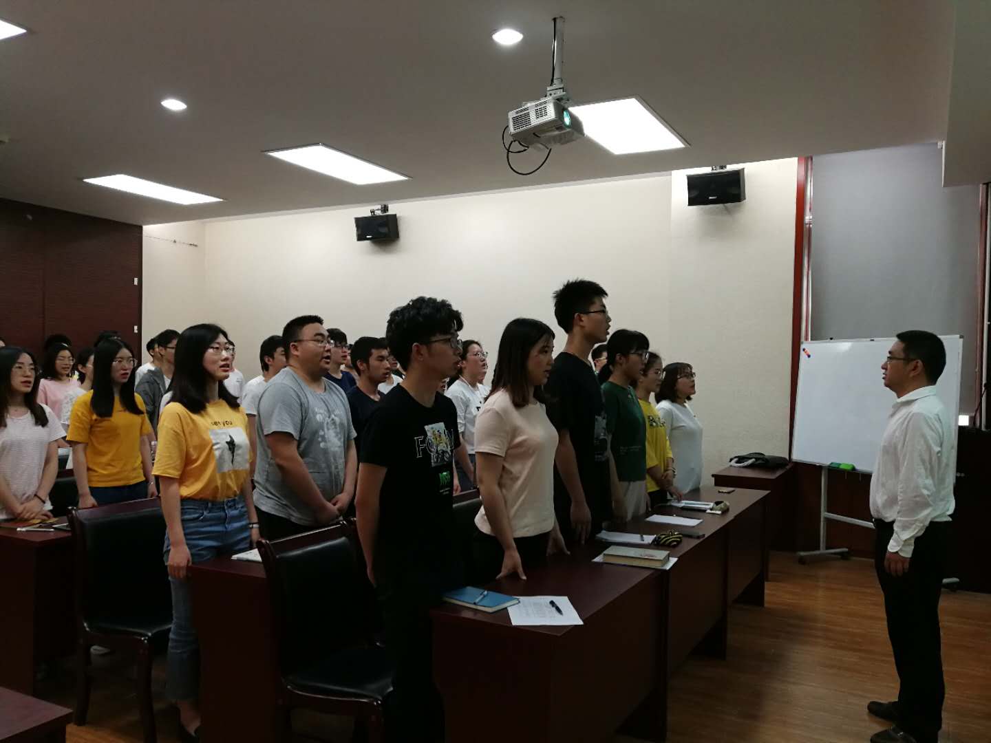党课开始之前,袁勤号召在场同学一起演唱国歌《义勇军进行曲》,接着袁勤为大家解读了演唱国歌的目的与意义,希望大家无论何时何地都要热爱祖国。