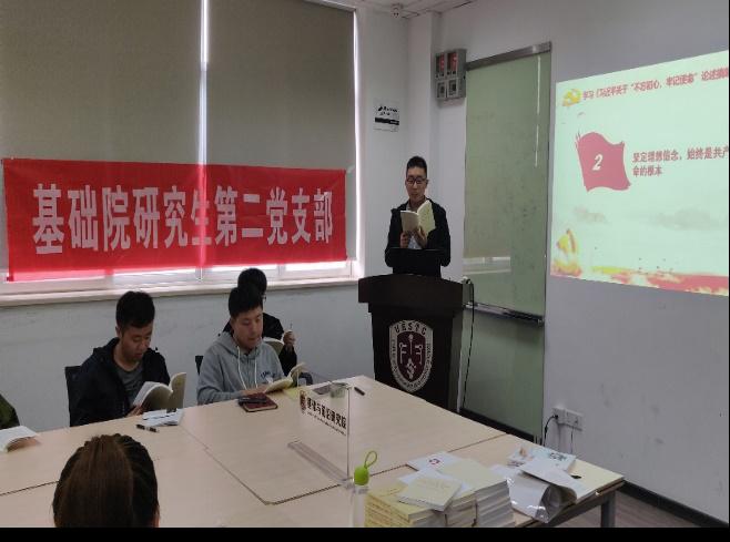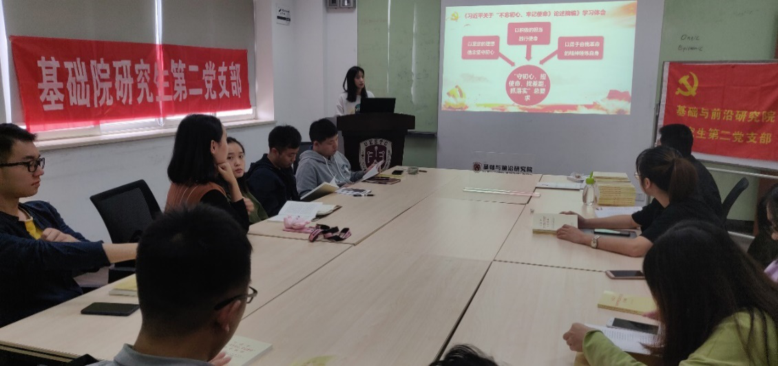为深入学习和贯彻党的十九大精神,深刻领会习近平总书记新时代中国特色社会主义思想,增强党员的家国情怀和历史责任感,10月19日下午,基础院研究生第二党支部在沙河通信楼816开展“不忘初心、牢记使命——奋勇争先担使命 我以青春颂祖国”专题学习,会议由支部书记陈怡颖主持,支部全体党员和积极分子参加。