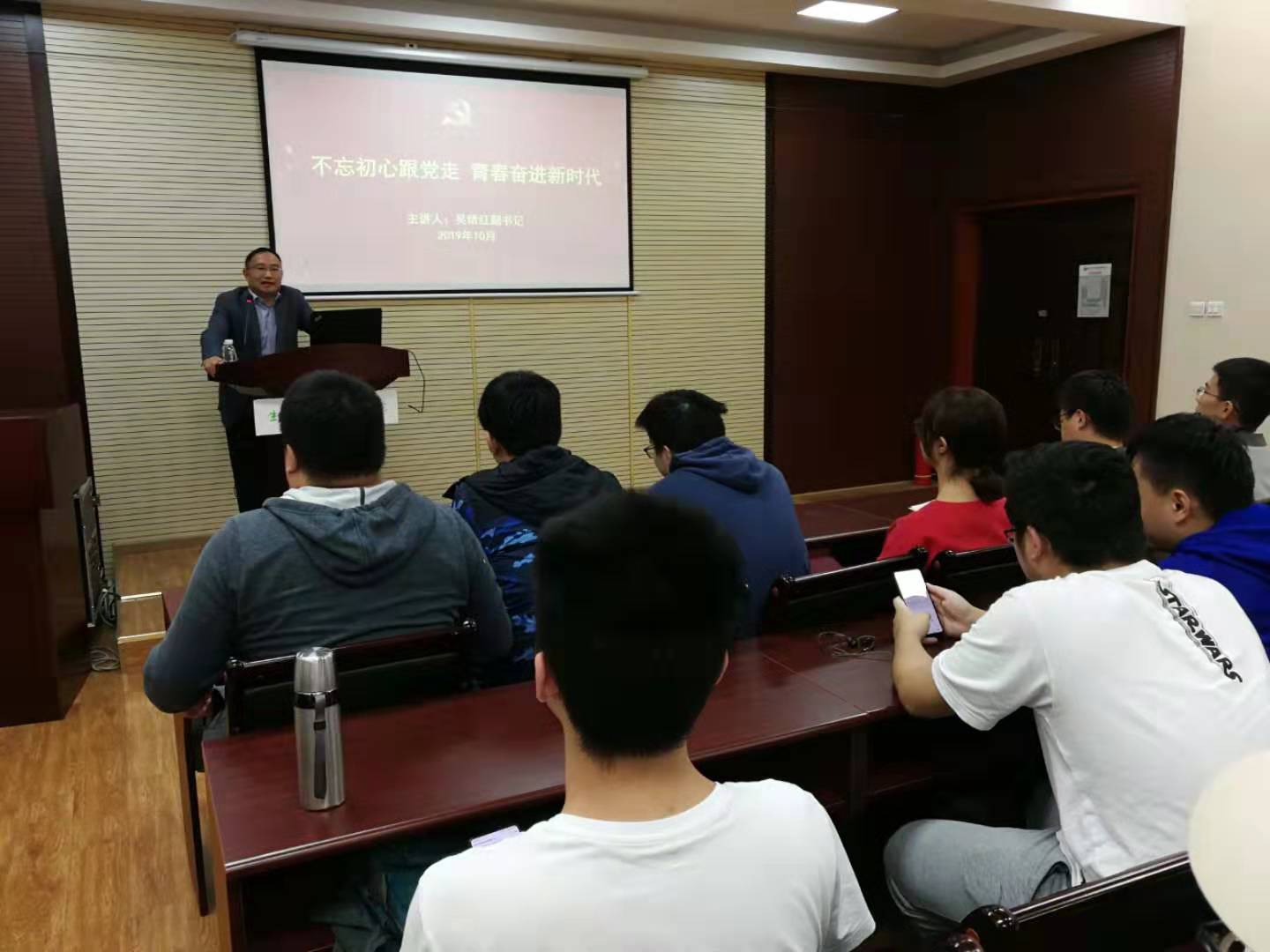 10月22日下午16:20,生命学院党委副书记吴绪红以“不忘初心跟党走,青春奋进新时代”为题,为学院本科生党支部党员等近40人讲专题党课。吴绪红从“不忘初心跟党走” “青春奋进新时代”“脚踏实地谱新篇”等三个方面做了讲解。吴绪红首先结合习近平总书记有关重要论述的学习体会,谈了对于“初心”和“新时代”的理解;接着,他结合新中国从“站起来”到“富起来”和“强起来”的重大变化,希望同学们要“让理想信念在创业奋斗中升华,让青春在创新创造中闪光”;最后,他从“珍爱生命”“奋进生命”“动感生命”“时尚生命”“温馨生命”等五个“生命”,阐述了生命学子“脚踏实地谱新篇”的具体举措。
