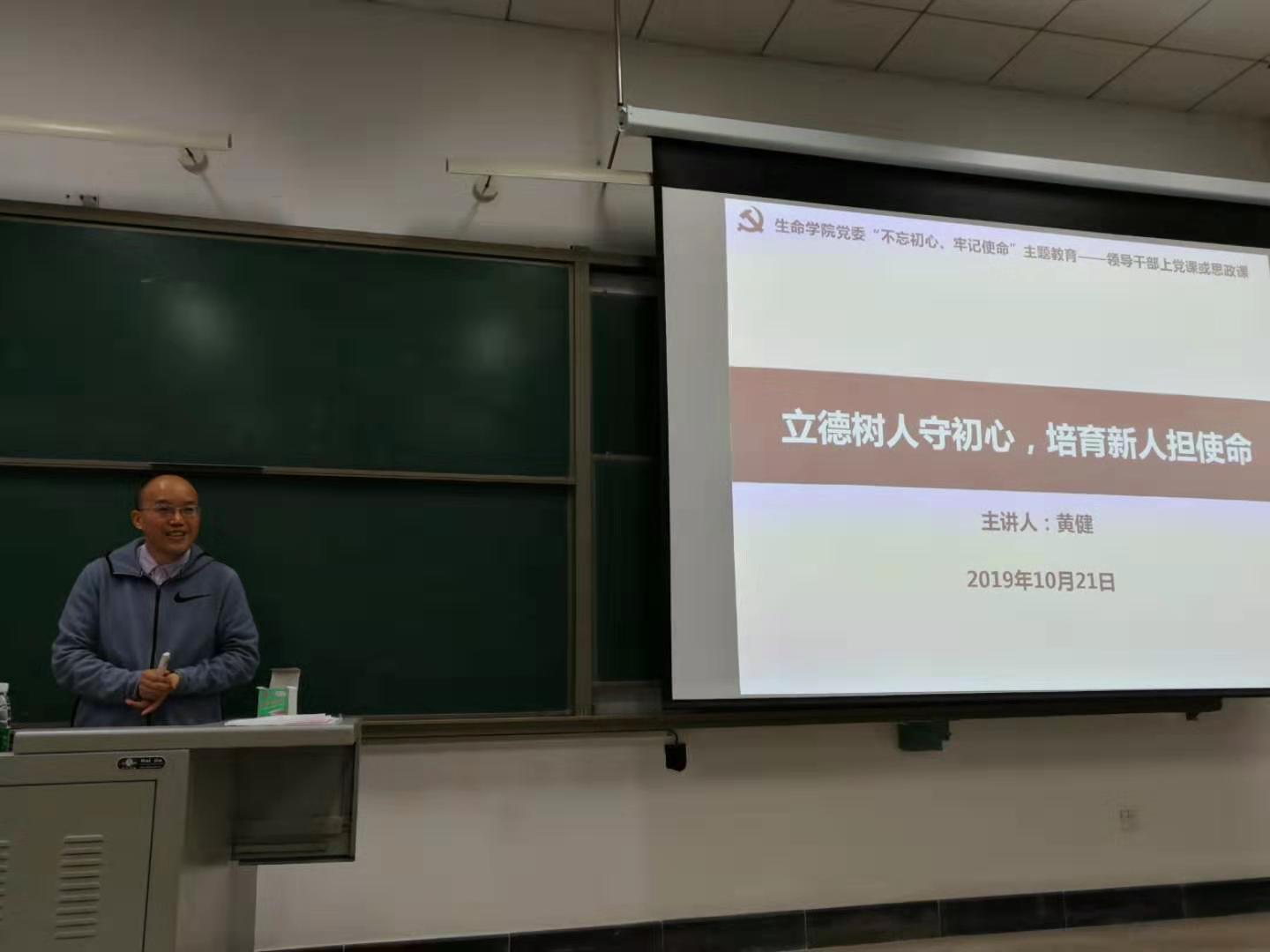 10月21日下午16:20,生命学院副院长黄健以“立德树人守初心,培育新人担使命”为题,为学院 2019级本科生近100人讲专题思政课。黄健从“如何理解初心与使命” “习近平有关立德树人重要论述的学习体会”“培育生命精英人才”等三个方面做了讲解。他强调,中国共产党的初心和使命是“为中国人民谋幸福,为中华民族谋复兴”,生命学院的初心和使命就是为国家培育生命精英人才。他谈到,通过观看国庆阅兵,真切地为祖国的富强而自豪;希望同学们好好学习,早日担负起民族复兴的重任。