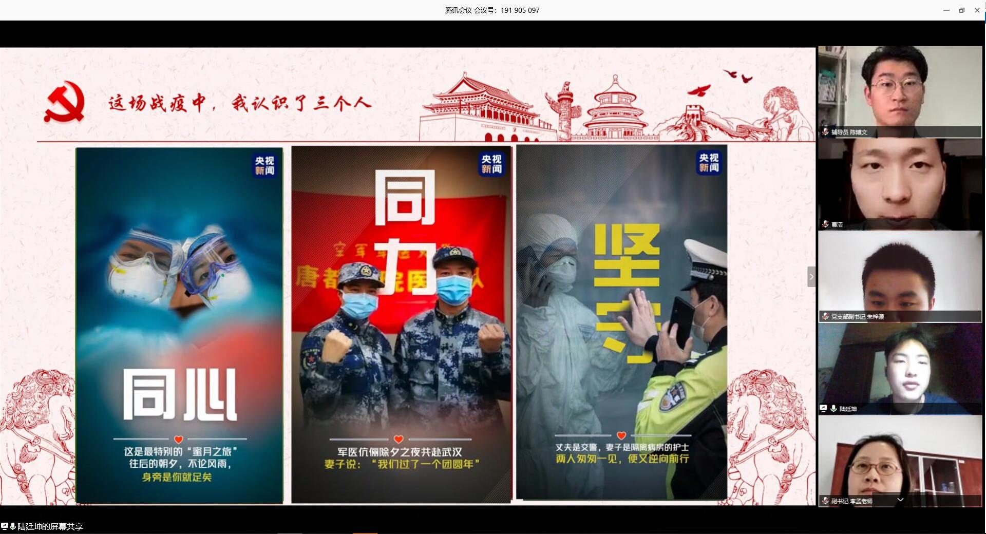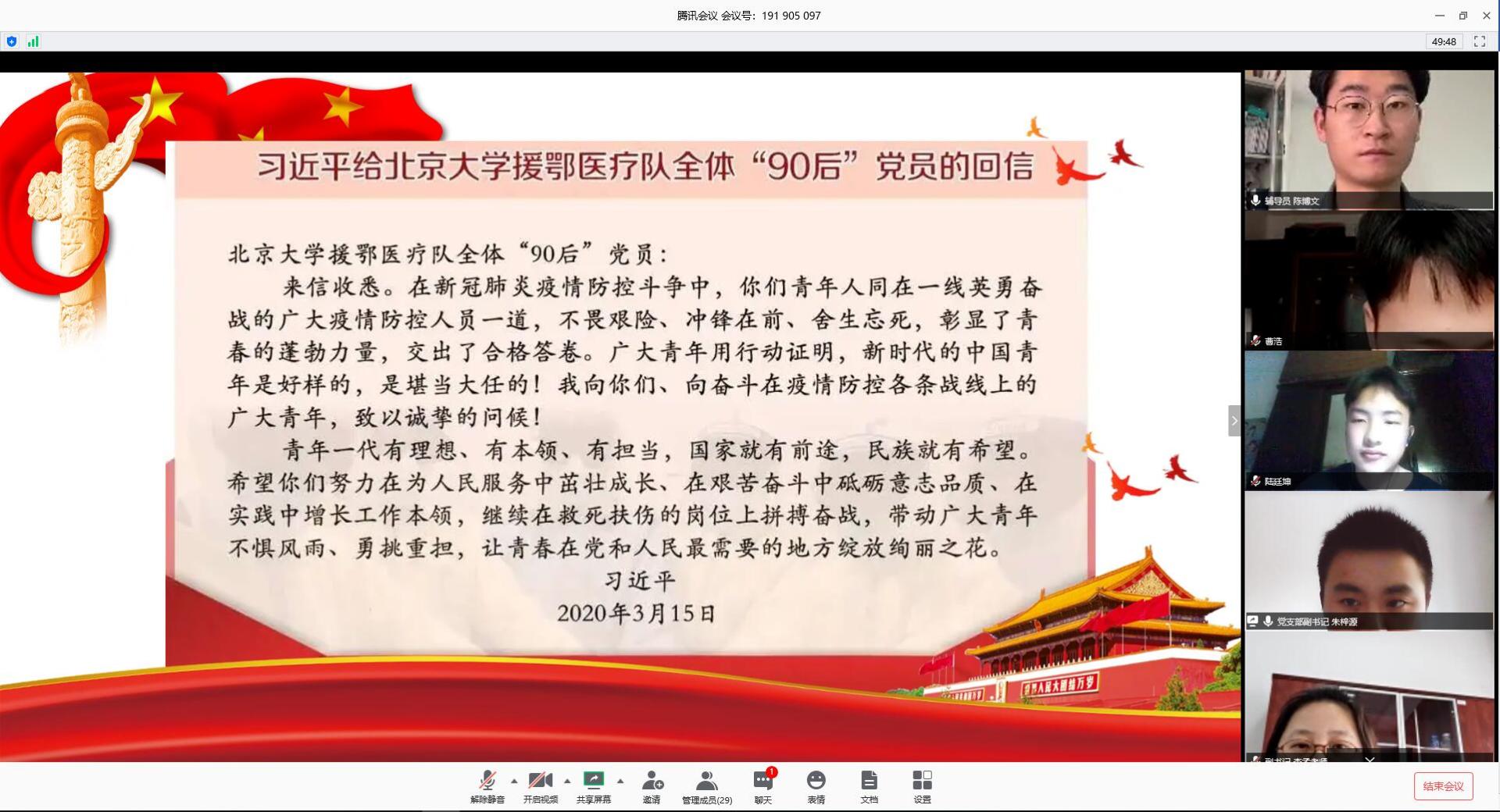 首先,支部学生书记朱梓源带领大家深入学习了习近平总书记给北京大学援鄂医疗队“90后”党员的重要回信精神。在信中,习近平总书记再次提到:“青年一代有理想、有本领、有担当,国家就有前途,民族就有希望”。学习之后,支部同志们纷纷表示,此次疫情中,“90后”医务工作者用行动践行着使命与担当,向我们展示了青年一代的无畏精神,和守望相助的家国情怀。