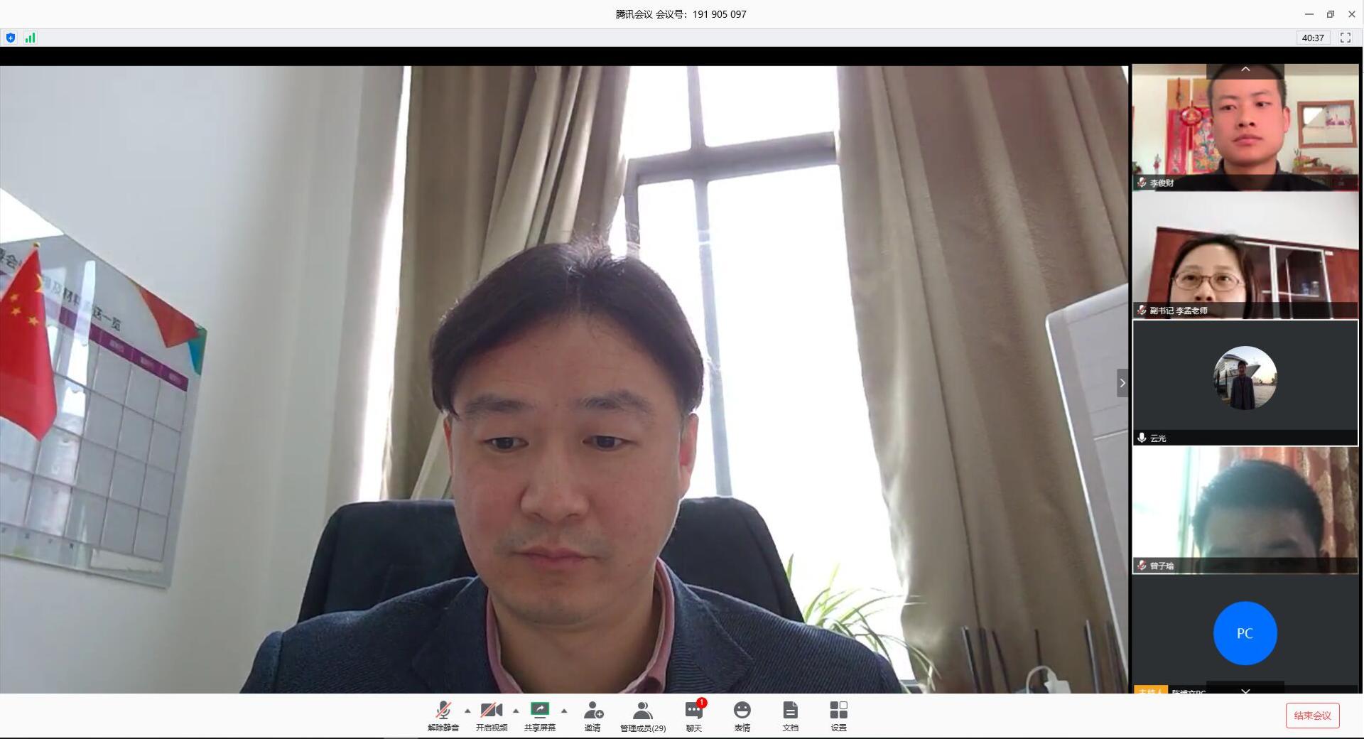 随后,钱云光与支部成员开展了深入交流。他首先代表学工部,对支部的同学们表达了关心和问候,他希望同学们在家注重自身防护,强身健体;接着,他分享了自己的学习体会,他提到,此次疫情防控,人民军队再一次冲锋在前,全力以赴,维护了人民和社会安全,彰显了军人的英雄本色,此外,青年党员在抗疫一线发挥了重要作用,青年一代是堪当大任的。最后,钱云光指出,国防生党支部一直以来都有良好的传统和文化,希望同志们继续努力,传承我校国防生文化,将献身国防的家国情怀传递到更多的学生群体中去。钱云光还就同学们关心的其他问题进行了交流。