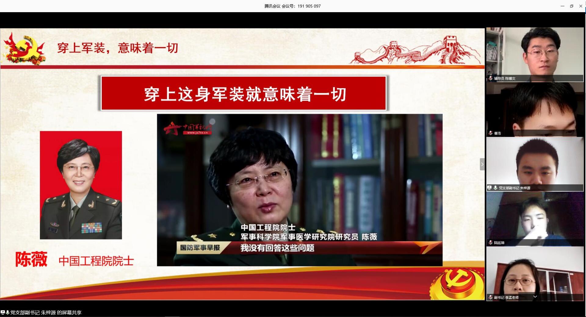接着,支部开展党员微党课活动。朱梓源以“众志成城勇战疫,军人使命显担当”为主题,向我们讲述了疫情开始以来,人民军队紧急驰援武汉的事迹。同时,他讲述了陈薇院士等在疫情中涌现的抗疫事迹,号召同学们作为成电国防生,要坚定新时代国防强军信心,时刻做好准备,在危急时刻挺身而出,让祖国和人民放心。