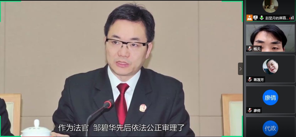 研究生第五党支部书记龚胜男同学:视频中邹碧华法官的一句话,令人印象深刻,他说:“我一定要把这个岗位上的价值发挥到淋漓尽致,我一定要把做人的价值发挥到淋漓尽致。”人生而平凡,然而人的一生又是不平凡的。怎样发挥出人生的价值又是一门学门。我很荣幸自己成为了一名共产党员,这不仅仅是一个称号更是一种担当。习近平总书记说:“使命呼唤担当,使命引领未来。”党的初心和使命就是为中国人民谋幸福,为中华民族谋复兴。作为华夏儿女,作为党的一员,我愿矢志不渝地为实现中国梦而贡献自己的一份力量。