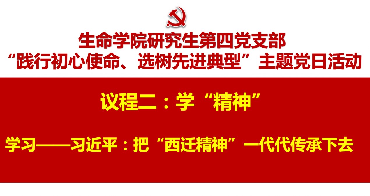 本次主题党日活动由生命学院党委进行组织策划,分为“学‘精神’,增强理论素养” “看‘视频’,感悟初心使命” “评‘模范’,选树先进典型”等三个环节。