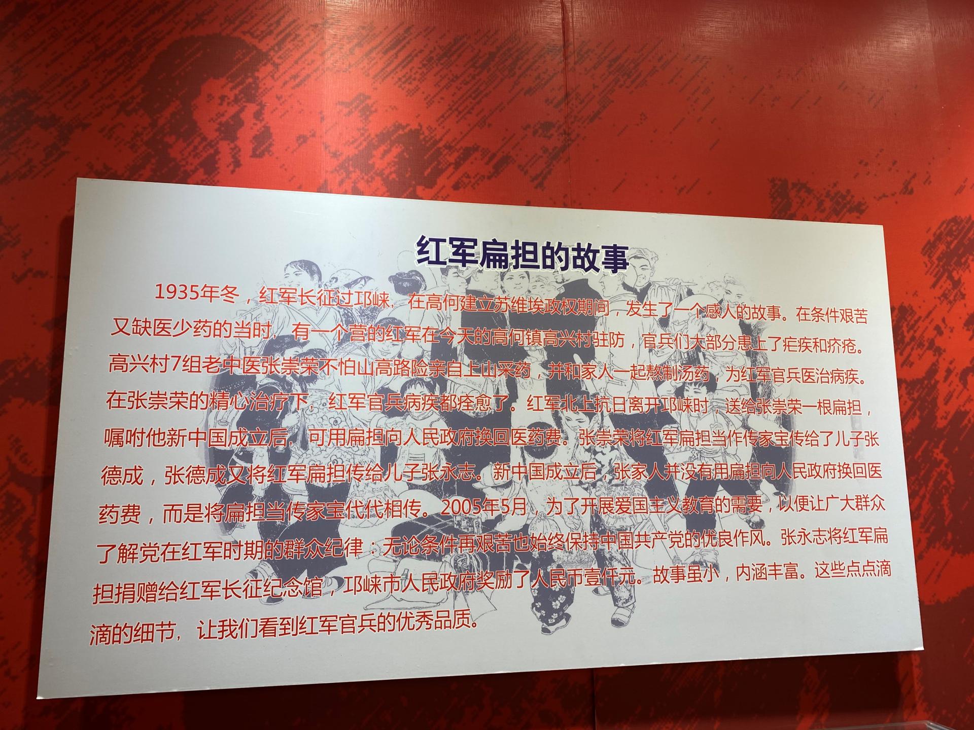 1934年10月,中国共产党领导中国工农红军开始了二万五千里长征,1935年11月到1936年2月,红四方面军途径邛崃,并在邛崃地区扩区、备战、筹粮、响亮提出了“抗日反蒋”的口号,在这难忘的峥嵘岁月里,留下了无数可歌可泣的光辉事迹,一根扁担,承载的无不是军民的深情厚谊。