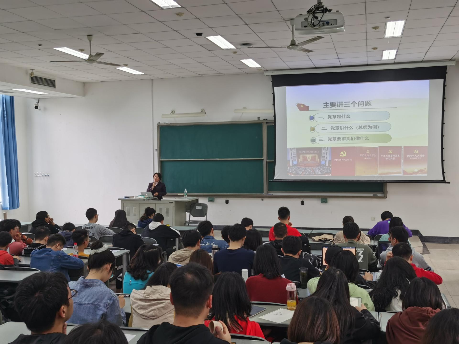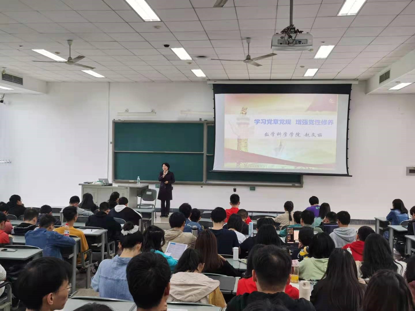 党章是党的总章程,深入学习党章党规、严格遵守党章党规、认真贯彻党章党规、坚决维护党章党规,是每一名党员应尽的义务。2021年4月22日下午,数学科学学院党委副书记赵文丽同志为数学-机电分党校全体发展对象讲授《学习党章党规 增强党性修养》的党课。希望同学们坚定理想信念、树立远大目标,坚定不移听党话、跟党走,自觉接受党组织的教育培养、锻炼考验,积极努力早日加入党组织。