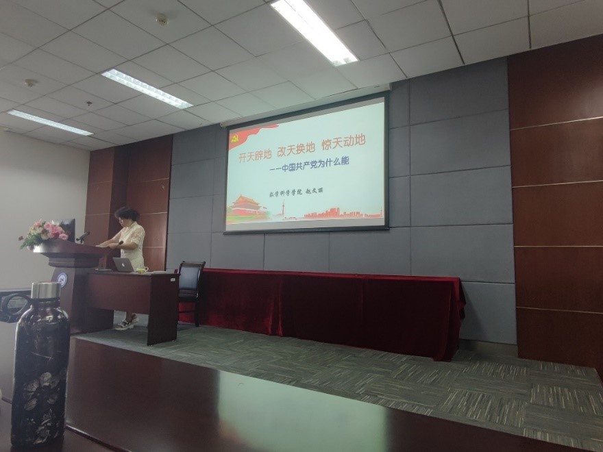 2021年5月31日,数学科学学院硕士生第三党支部和第四党支部在主楼A1-503会议室联合举办主题党日活动,邀请学院党委副书记赵文丽同志为两个支部全体党员和发展对象们讲授党史学习教育专题党课,党课的主题为“中国共产党为什么能”。活动由第三党支部书记毛新羽同志主持。