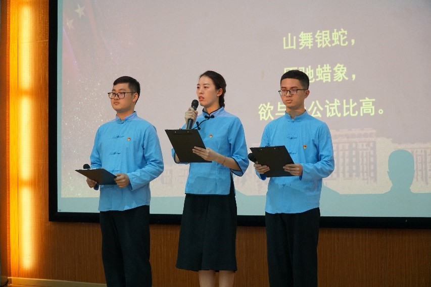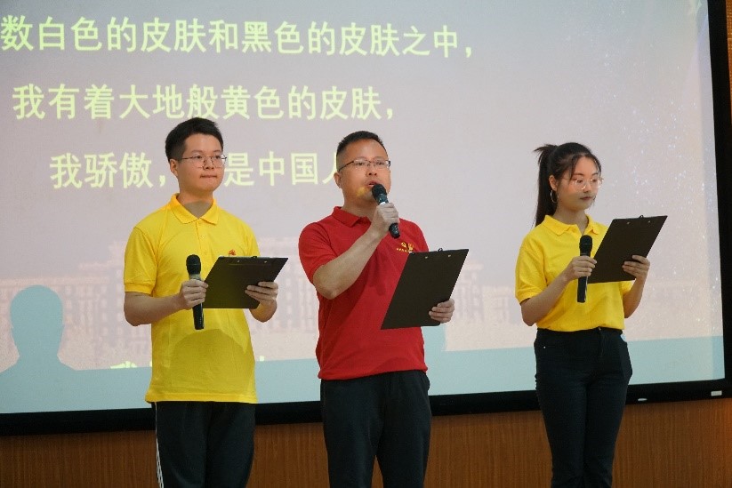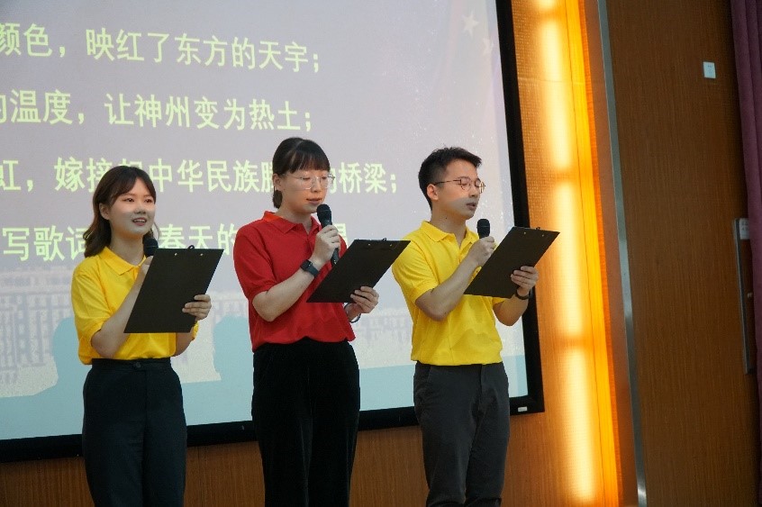 诵读环节分别由研究生第一党支部学生党员与应用化学系党支部教师王妮诵读《党旗颂》 ,由研究生第三党支部学生党员诵读《沁园春·雪》,由研究生第六党支部学生党员与材料系二支部教师张亚刚诵读《我骄傲,我是中国人》。同时,全体齐唱《没有共产党就没有新中国》,共迎党的生日。
