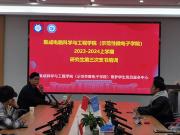 为加强支部建设,增强组织生活活力,11月15日晚,集成电路学院组织召开2023年“团队芯·芯党建”支部书记及党员骨干系列培训第三期培训会。培训会邀请到校党委组织部黄健老师主讲,学院各学生党支部书记、支委和微梦学生党员服务中心部分成员参会。