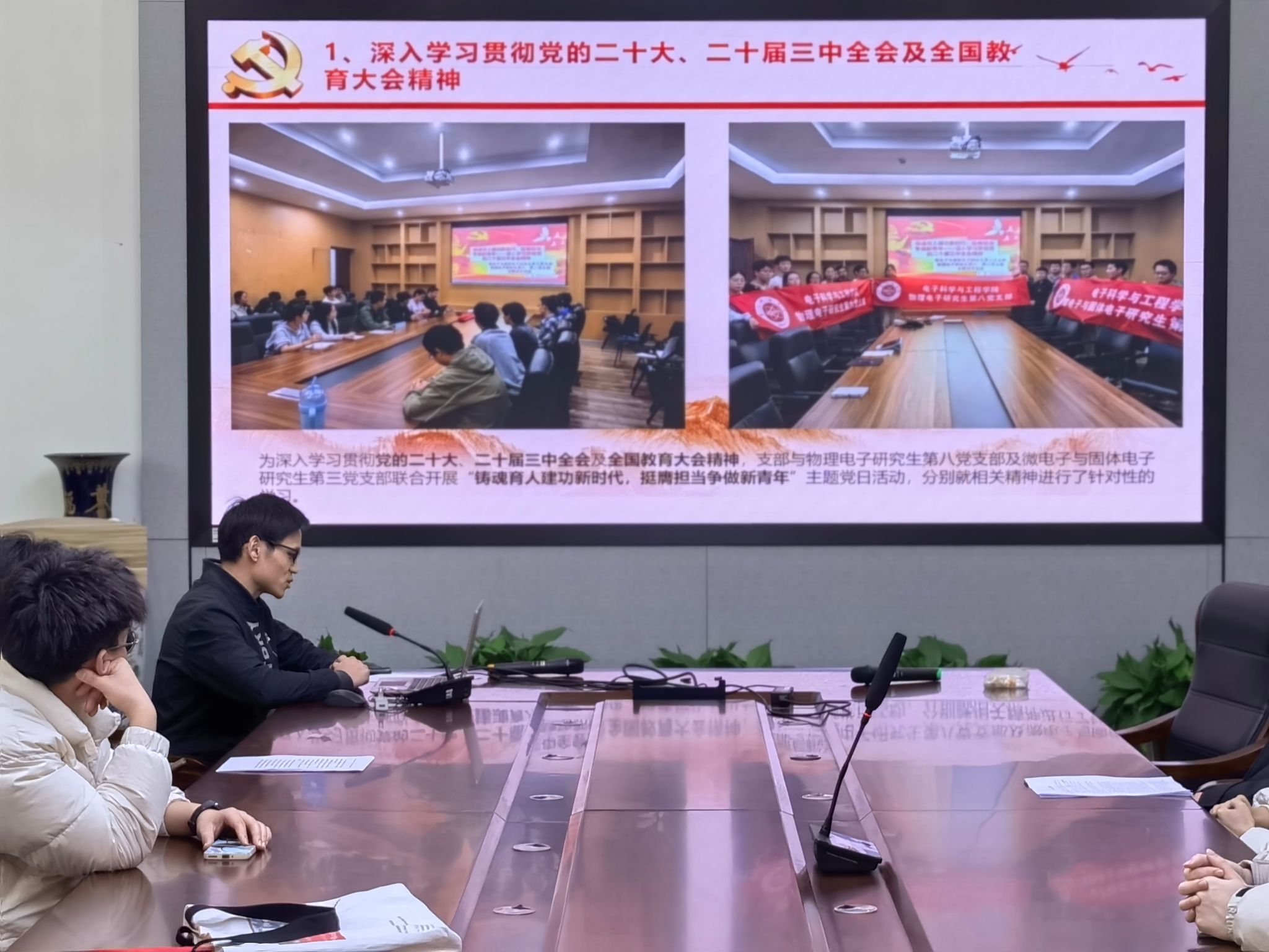 集成电路科学与工程学院电子功能薄膜与器件研究室研究生第一党支部赵庆极同志汇报了支部在政治建设、组织建设、纪律建设、群众工作上取得的成果。特别是支部组织开展的芯传承——高校探访活动,为引导少年儿童树立共产主义远大理想,大力弘扬科学家精神和科学精神,增强儿童讲科学、爱科学、学科学的意识。此外,支部通过阳光骑行等师生共同参与的活动极大地增强了支部凝聚力。